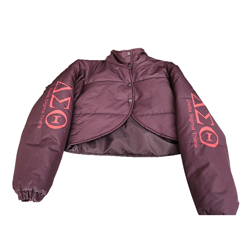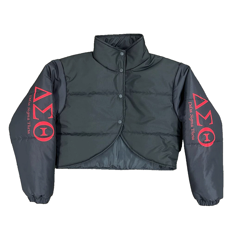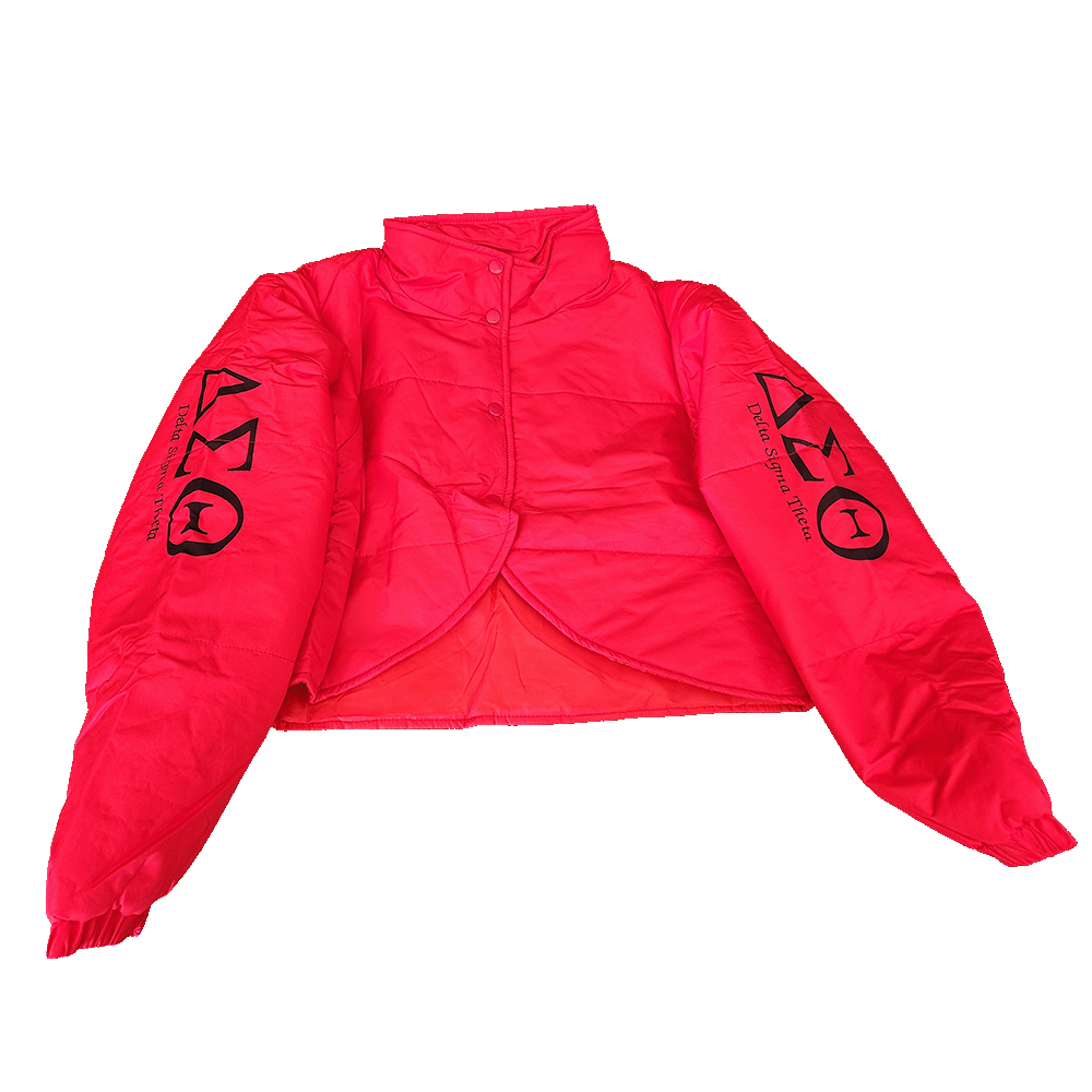 Designed in a vibrant red colorway with signature ΔΣΘ detailing on the sleeves, this custom-crafted piece is made to stand out from every angle.